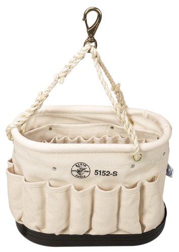 5152S Klein Oval Bucket with 41 PocketsLength 14" (356 mm).Width 7" (177 mm).Height 10" (254 mm).Pockets 26 inside pockets, 15 outside pockets.Extra features swivel snap