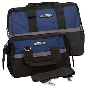 Durable ballistic construction with reinforced bottom. 21 pockets and extra-wide opening keep tools within reach. Complete with shoulder strap. (China) 12" Tool Bag